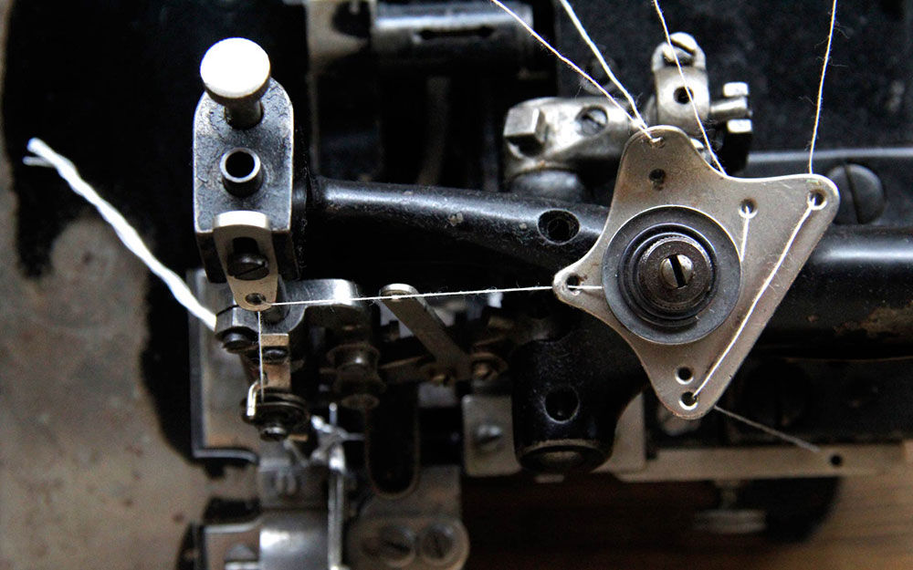アイロン、マチ針、ガイドを使わない「手曲げ縫製」を現代に甦えらせた。ミシンの選定、セッティング、メンテナンスも自ら行う。